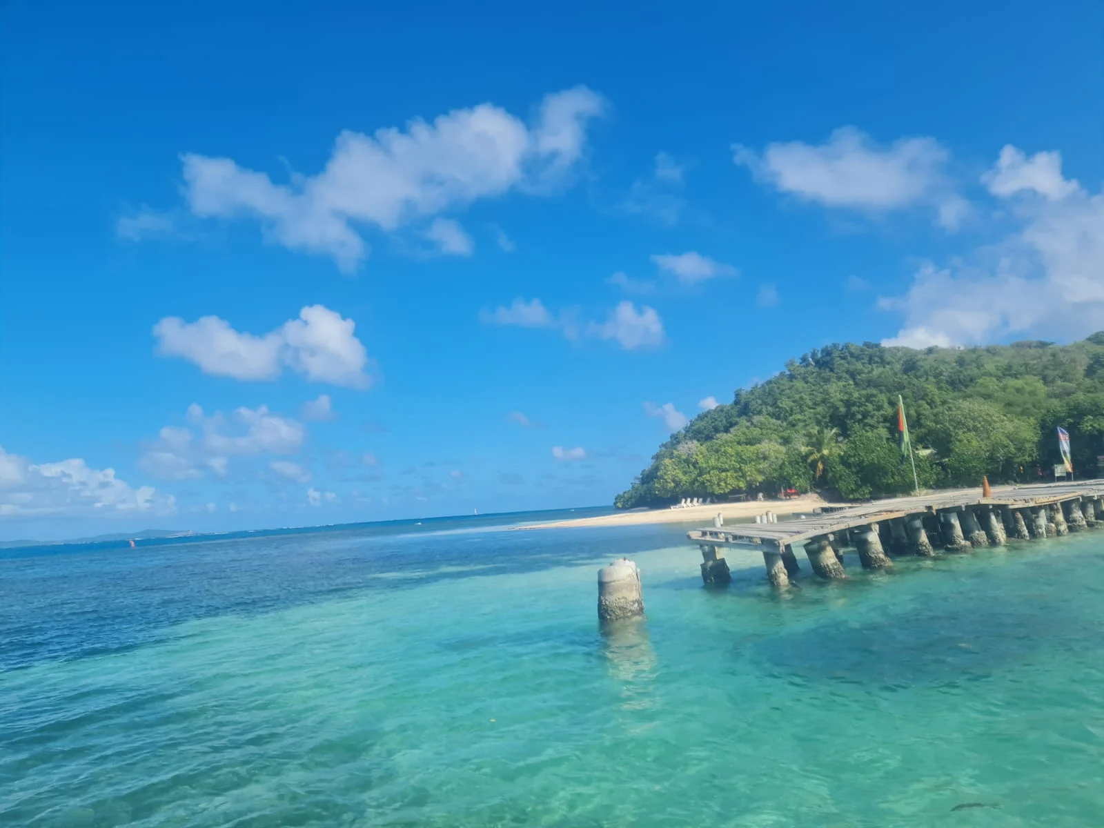 Cette image montre une plage tropicale avec un ponton en bois s’étendant sur une mer turquoise. Des collines verdoyantes bordent la côte sous un ciel clair et ensoleillé. Parfaite pour illustrer un cadre de vacances balnéaires sereines et paradisiaques.