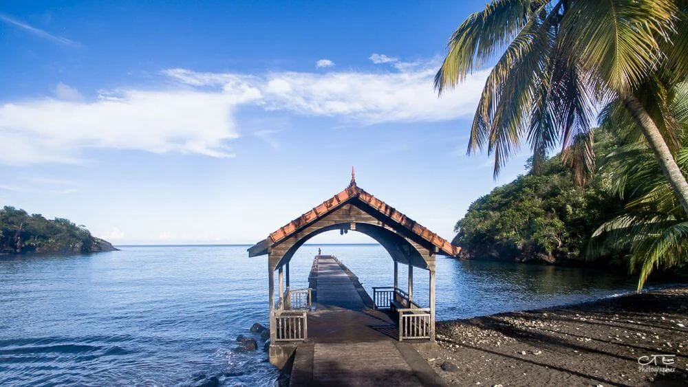 Cette image montre un quai en bois avec un toit rouge qui mène vers une eau calme, encadré par des palmiers et une plage ombragée. L’endroit paisible est idéal pour admirer le paysage côtier et profiter de la tranquillité de la mer.