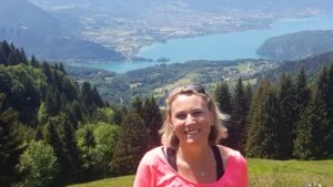 Une femme souriante se tient devant un paysage alpin spectaculaire où les montagnes verdoyantes entourent un lac scintillant. Cette scène évoque la sérénité et l’évasion en pleine nature, idéale pour les amateurs de randonnée et de paysages pittoresques.