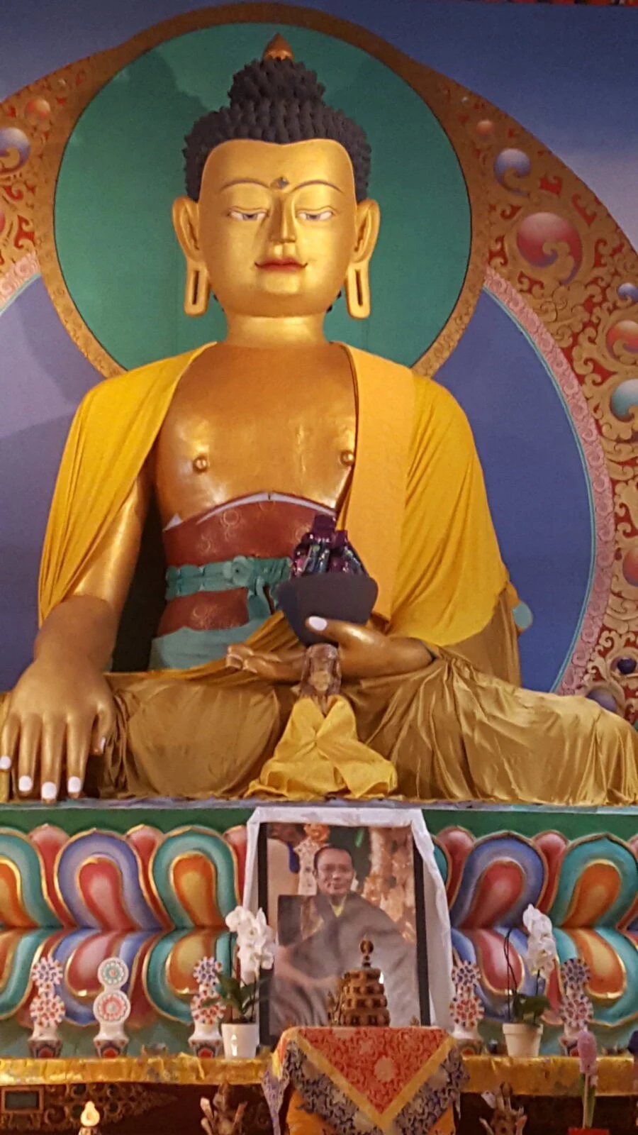 Statue dorée du Bouddha assis en méditation avec un vêtement jaune et un autel orné de fleurs et d'un portrait en dessous