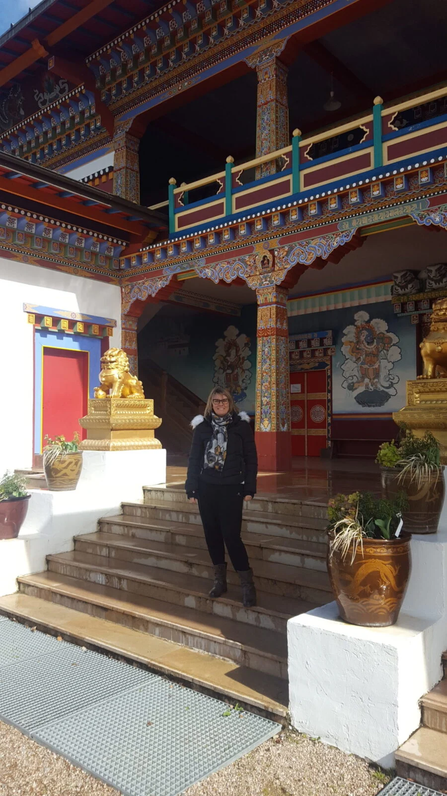femme debout sur des escaliers devant un temple bouddhiste coloré avec statues dorées et décorations traditionnelles