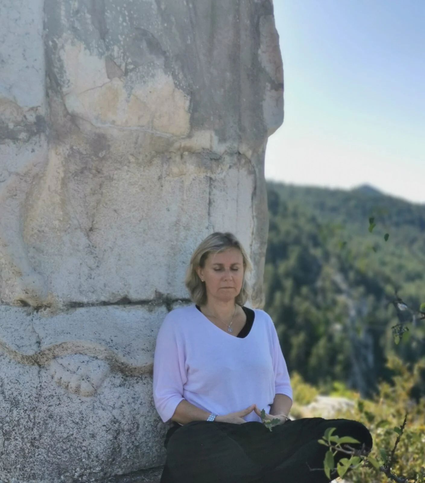 Cette image montre une femme méditant assise contre un grand rocher avec un paysage verdoyant en arrière-plan. Le cadre naturel et serein souligne le thème de la méditation et de la relaxation en plein air.