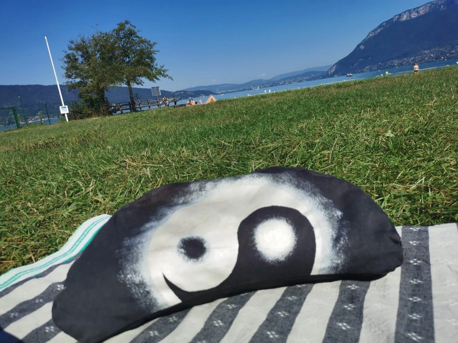 Cette image montre un coussin de méditation placé sur l’herbe d’un parc ensoleillé situé au bord d’un lac. Avec le lac et les montagnes en arrière-plan, le cadre est idéal pour la détente et la méditation. La scène invite à profiter d’un moment de tranquillité dans la nature.