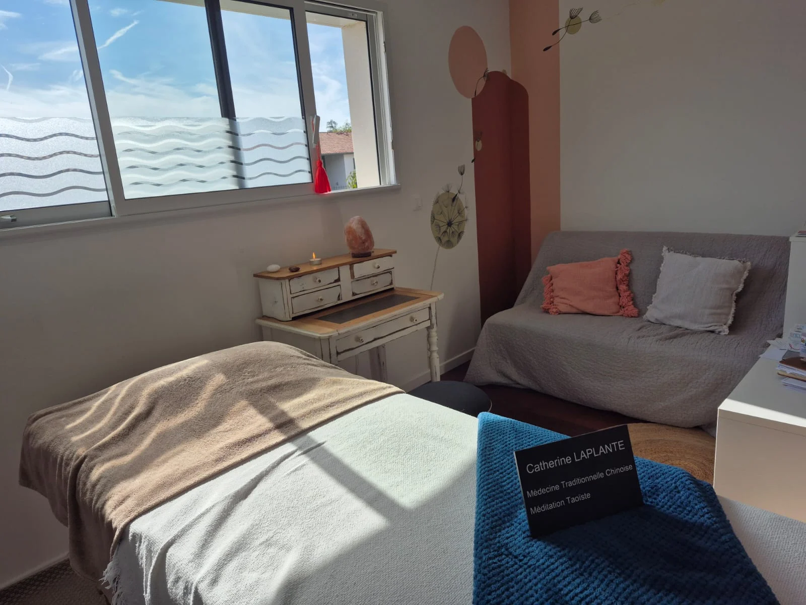 Cette salle de soins aux tons doux et naturels offre un environnement calme et relaxant. La pièce est aménagée avec une table de massage et un canapé, idéale pour des séances de médecine traditionnelle chinoise et de méditation taoïste.