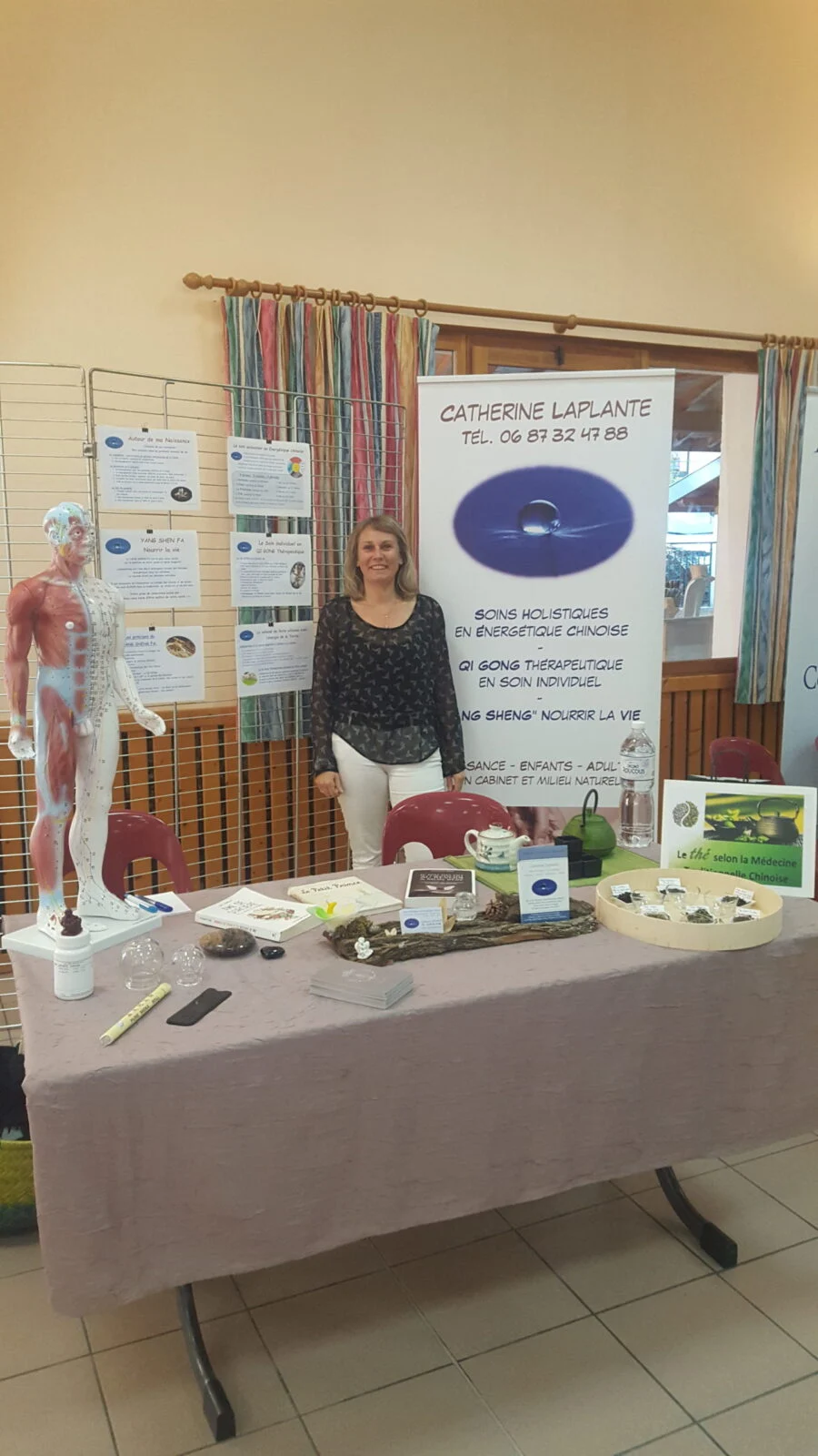 stand de soins holistiques en énergétique chinoise avec accessoires, livres, modèle anatomique et affiches explicatives