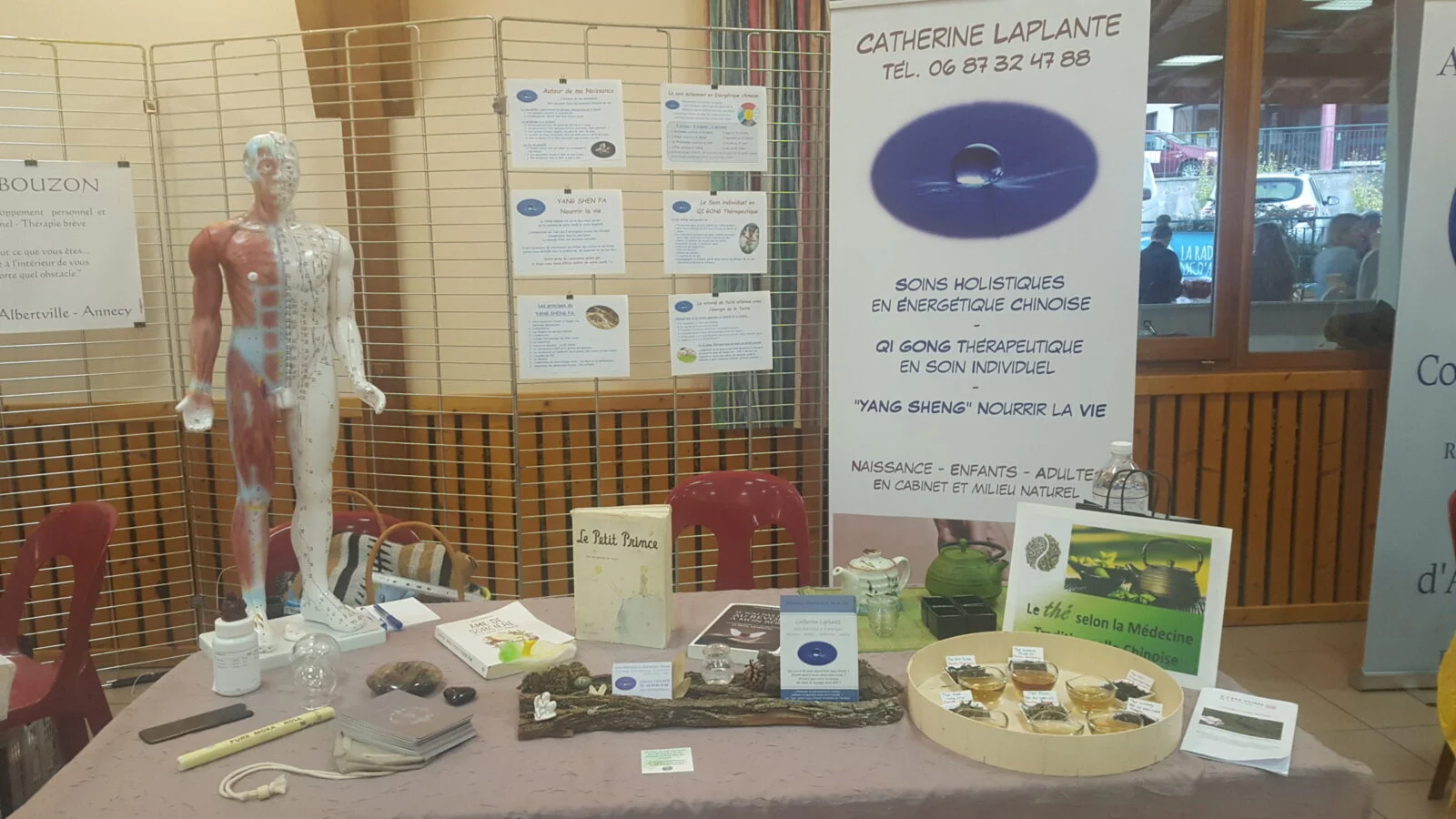 stand présentant modèle anatomique, brochures et thé chinois pour soins holistiques et Qi Gong thérapeutique par Catherine Laplante
