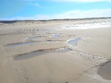 Cette image montre une étendue de plage de sable doré parsemée de petites flaques d’eau laissées par la marée basse. L’horizon est dégagé, soulignant la beauté tranquille du paysage côtier sous un ciel bleu lumineux.